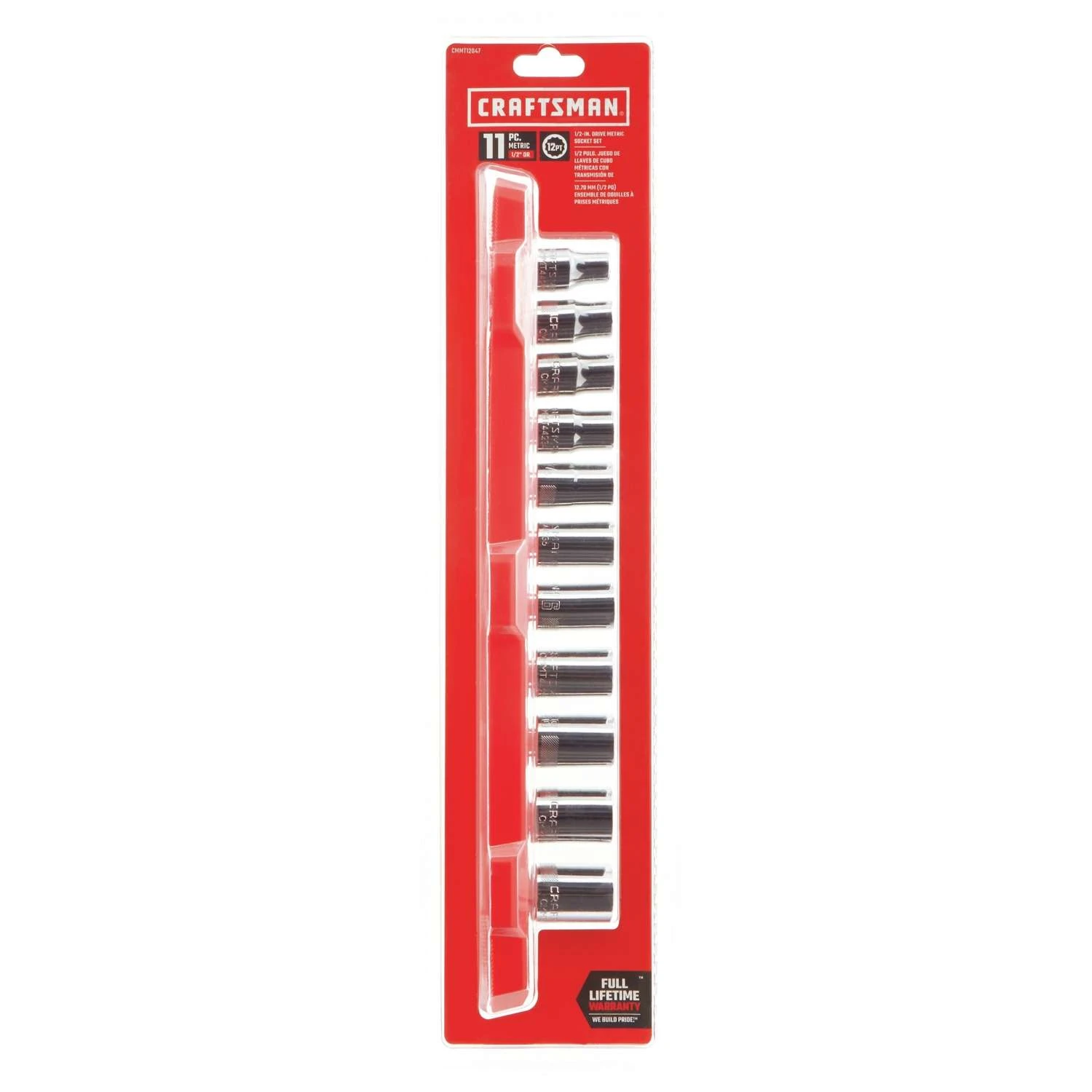 Craftsman 11 pc. 1/2-in. Drive 12 Point Metric Socket Set comes equipped with a broad assortment of sockets. This set is perfect for automotive repair, general construction, and DIY repairs.CORROSION RESISTANCE: Full Polish Chrome FinishQUICK ENGAGEMENT: 12 Point Box End with fastenerQUICK SIZE IDENTIFICATION: Large MarkingsMeets or Exceeds ASME Specifications