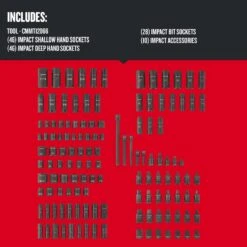 | What's Included | (46) Impact Shallow Hand Sockets, (46) Impact Deep Hand Sockets, (28) Impact Bit Sockets and (10) Impact Accessories |