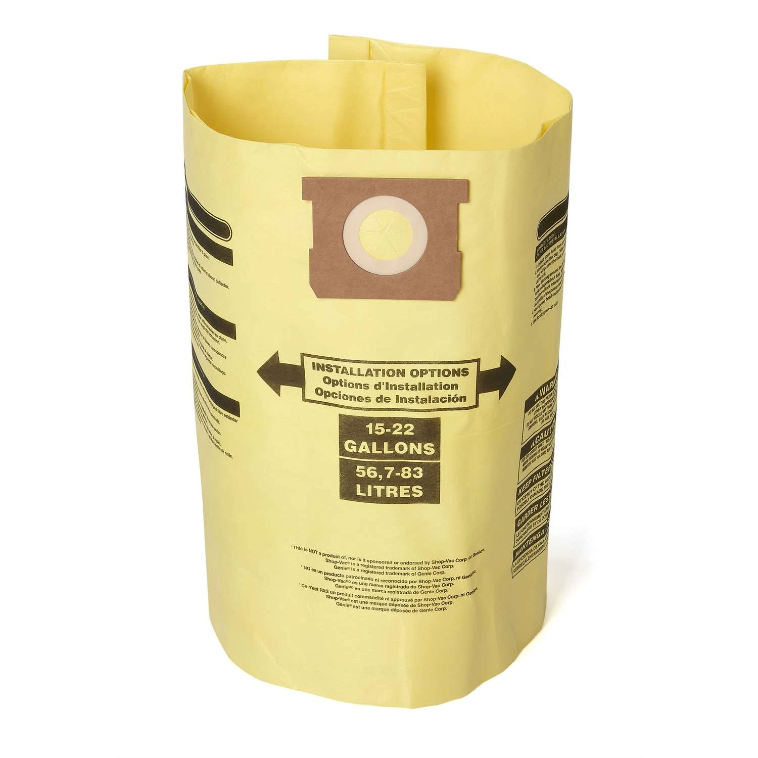 The CRAFTSMAN 15 to 22 gallon Fine Dust/Drywall Dust collection bags for wet/dry vacs are designed for pick-up of drywall dust, cold ashes, ultra-fine particles and other dry debris pick-up. These filter bags fit most 15-22 gallon Shop Vac brand vacs. Trap debris conveniently with these dust collection bags for easy disposal. Bags are easy to install by attaching to vacuum port inside tank without needing tools and are even easier to toss away. This is NOT a product of, nor is it sponsored or endorsed by Shop-Vac Corp. Shop-Vac is a registered trademark of Shop-Vac Corp.FITS: 15 to 22 gallon Shop-Vac brand vacsDESIGNED FOR DRY PICK-UP: Dust bag for dry debris pick-up only to make clean-up fast and easyCOLLECTS FINE DUST: Dust bag designed for capturing fine debris such as drywall dust, cold ashes and ultra-fine particles *REDUCE CLEAN-UP TIME: Vacuum bag makes debris disposal quick and easy, reducing the time required to clean the wet dry vacuum cleanerINCLUDES: 2 dust bags