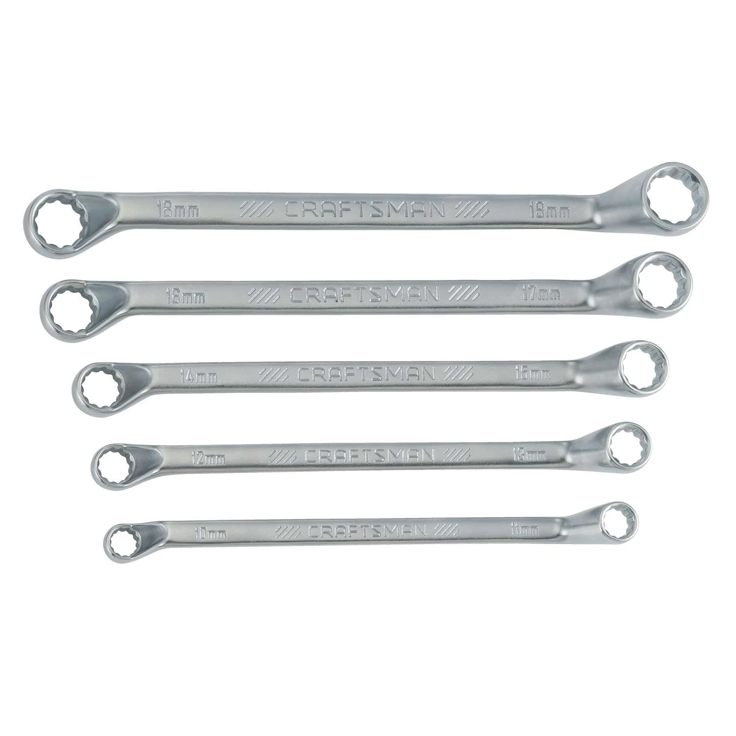 The CRAFTSMAN® 5-piece 12-point deep offset metric box-end wrench set features two 45-degree offset ends on each wrench for extra clearance in five metric sizes. These durable deep offset box-end wrenches are made to last and provide a boost of torque when you need to loosen stubborn nuts or put the final fastening touches on a variety of household projects. The set also includes a convenient storage tray for simple organization.Double Offset design for additional versatility, each end is offset by 45 degreesFull Polish Chrome finish for corrosion and rust resistanceConvenient storage tray for simple organizationCRAFTSMAN Full Lifetime Warranty