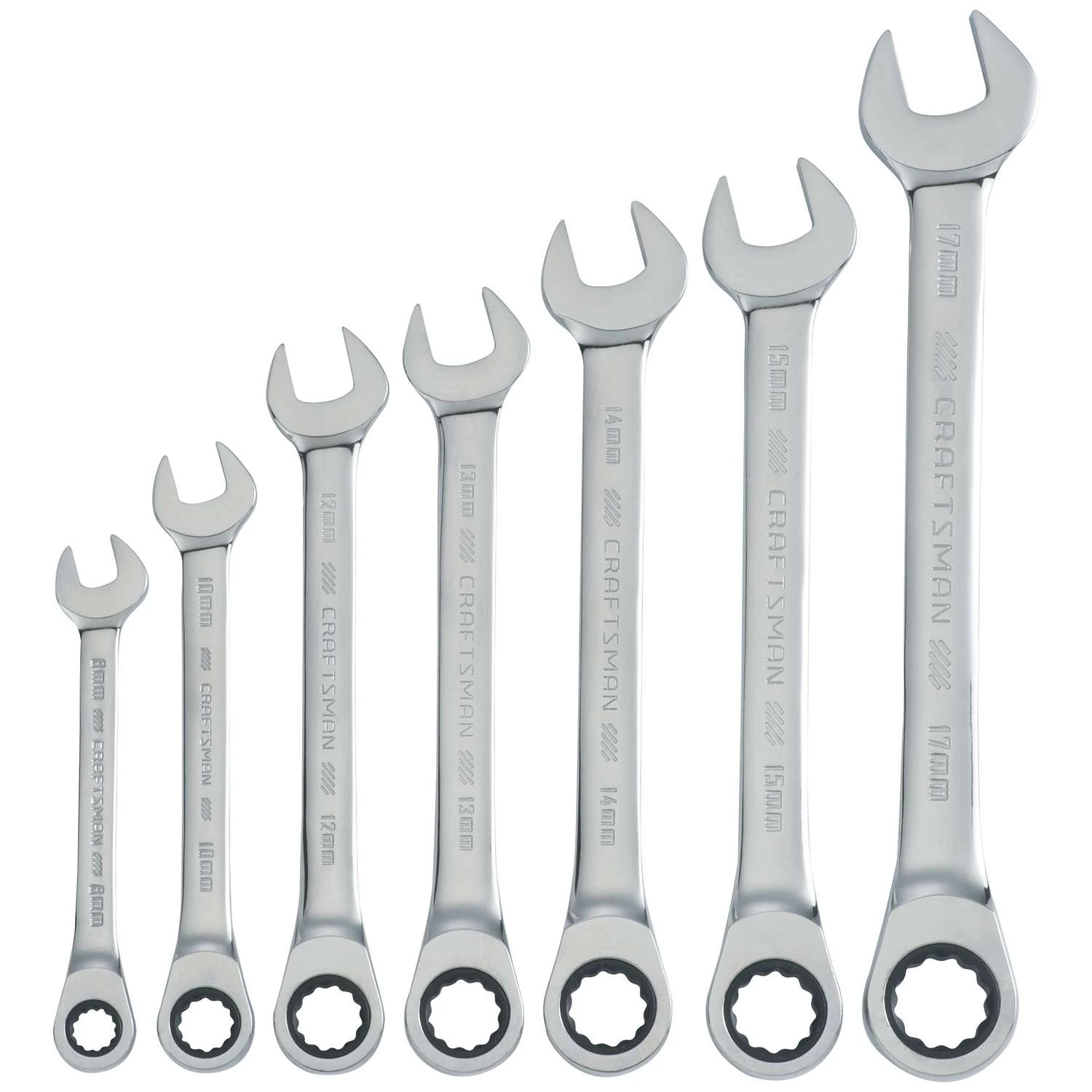 The CRAFTSMAN® 7-piece Metric Ratcheting Combination Wrench Set offers a number of applications from the standard bolt turning to working on specific automotive repairs.CORROSION RESISTANCE: Full Polish Chrome FinishQUICK ENGAGEMENT: 12 Point Box End with fastenerADDITIONAL KNUCKLE CLEARENCE: 15 Box End OffsetPROVIDES ACCESS in TIGHT SPACES: 72-tooth Ratcheting Box EndQUICK SIZE IDENTIFICATION: Large MarkingsMeets or Exceeds ASME Specifications