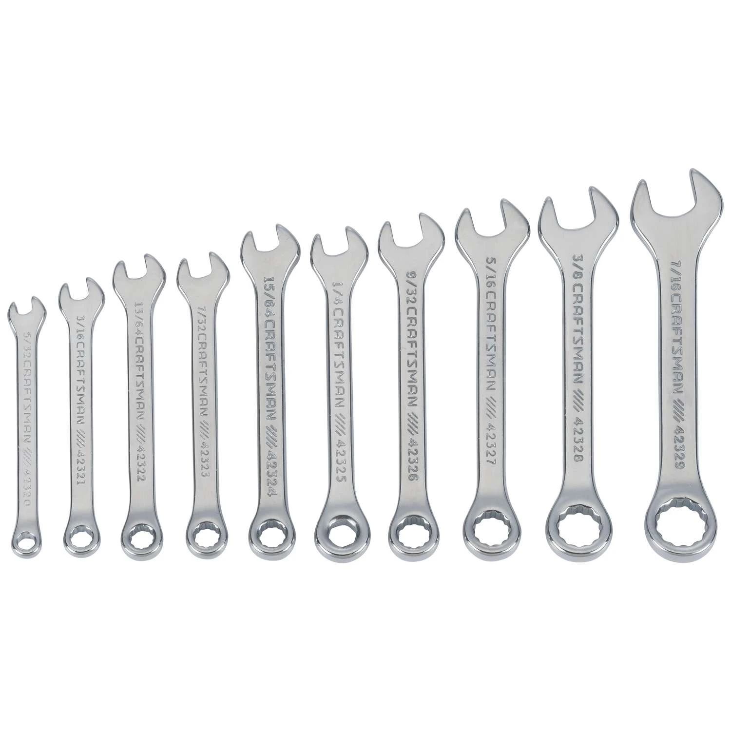 The Craftsman 10-piece Standard (SAE) Miniature Combination Wrench Set includes 10 wrenches, each crafted to feature a minature combination wrench design. These wrenches are the perfect solution for extremely difficult-to-reach areas. This set prioritizes quality and durability over everything else.Minature combination wrench design, both open and box ends provide great gripping of difficult-to-reach fastenersFull polish chrome finish for corrosion and rust resistanceTransparent pouch for easy size identification