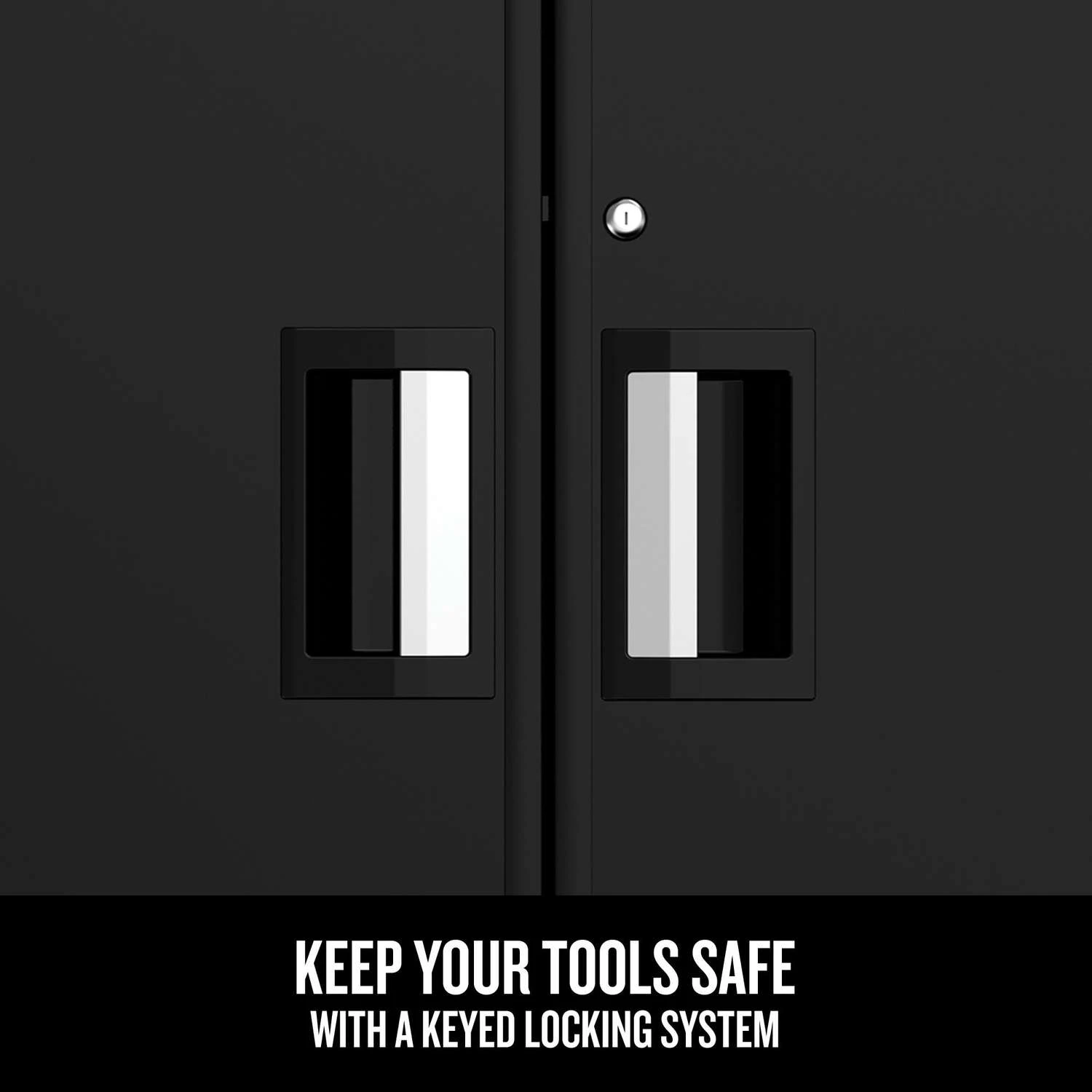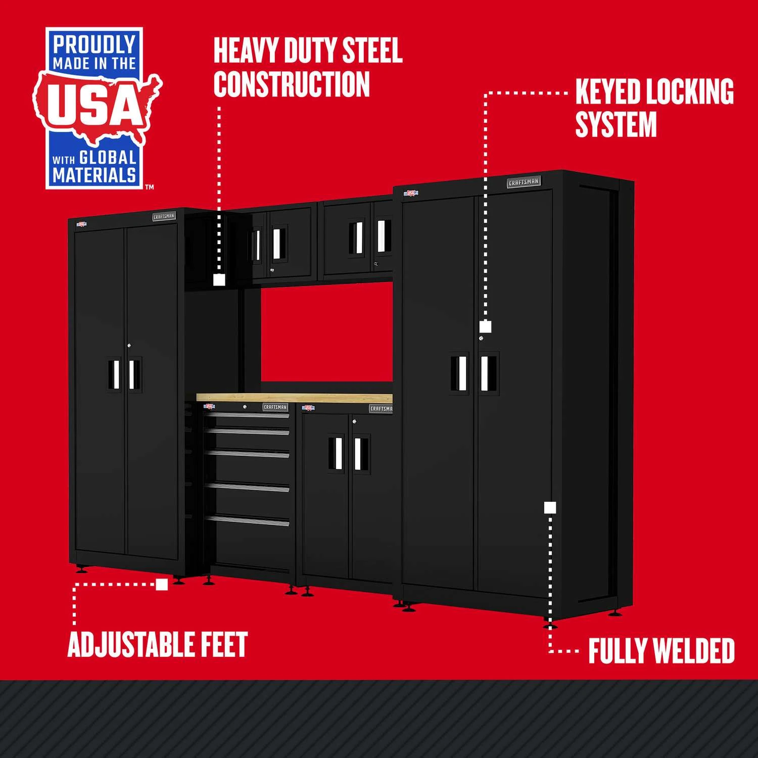 | What's Included | (2) Floor Cabinets, (1) 2-Door Cabinet, (1) 5-Drawer Cabinet, (1) Wall Cabinets, (2) Mounting Brackets, (2) Wood Work Surface, (6) Sets of Keys, Hardware for Installation |