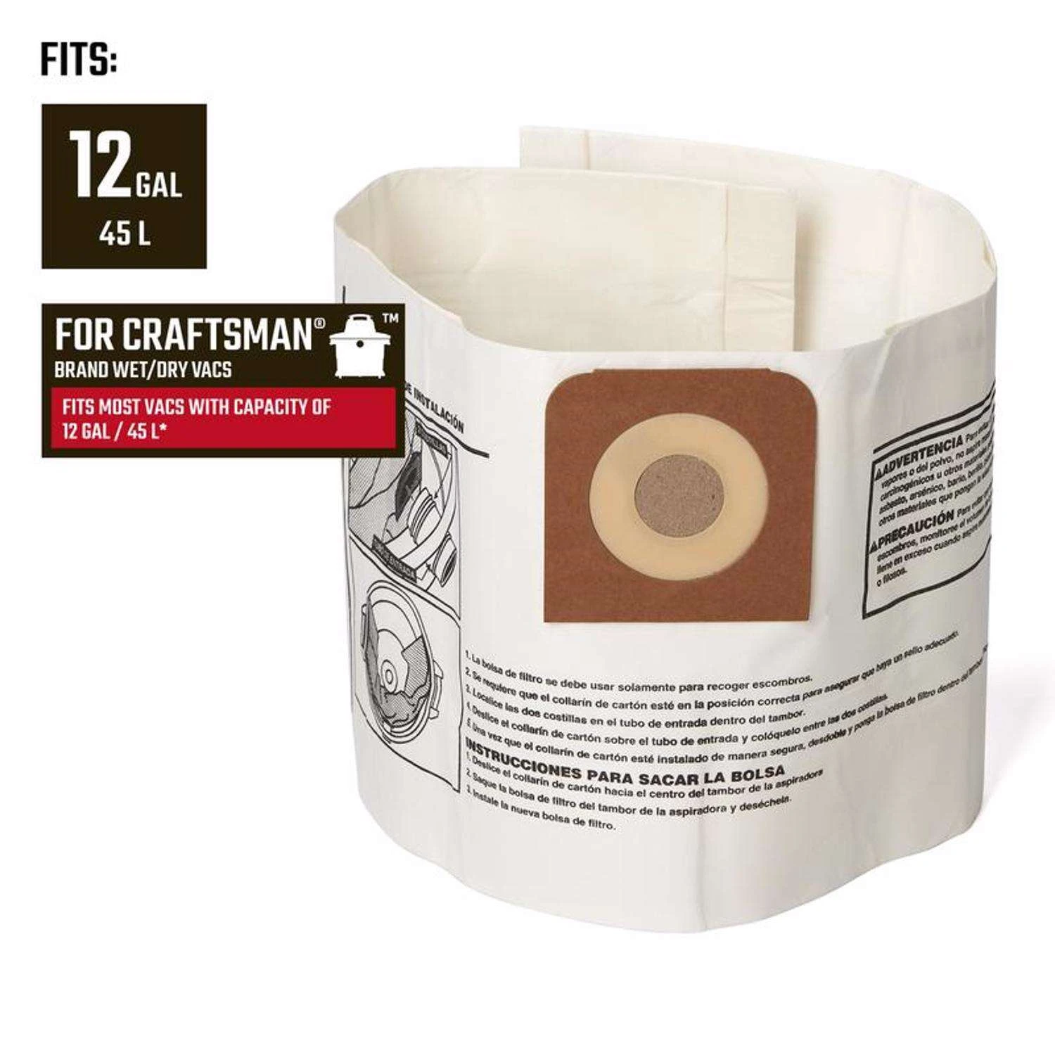 The CRAFTSMAN 12 Gallon Fine Dust/Drywall Dust Collection Bags for wet/dry vacs are designed for pick-up of drywall dust, cold ashes, ultra-fine particles and other dry debris pickup. They help contain all the debris from your home improvement projects, big or small, and keep your vac from blowing the fine particles back into the air. Bags are easy to install and even easier to toss away. Includes 2 dust bags.FITS: 12 gallon CRAFTSMAN vacsDESIGNED FOR DRY PICK-UP: Dust bag for dry debris pick-up only to make clean-up fast and easyCOLLECTS FINE DUST: Dust bag designed for capturing fine debris such as drywall dust, cold ashes and ultra-fine particlesREDUCE CLEAN-UP TIME: Vacuum bag makes debris disposal quick and easy, reducing the time required to clean the wet dry vacuum cleanerINCLUDES: 2 dust bagsCOMPATIBLE WET/DRY VACS: CMXEVBE17594 CRAFTSMAN Shop Vacuum *