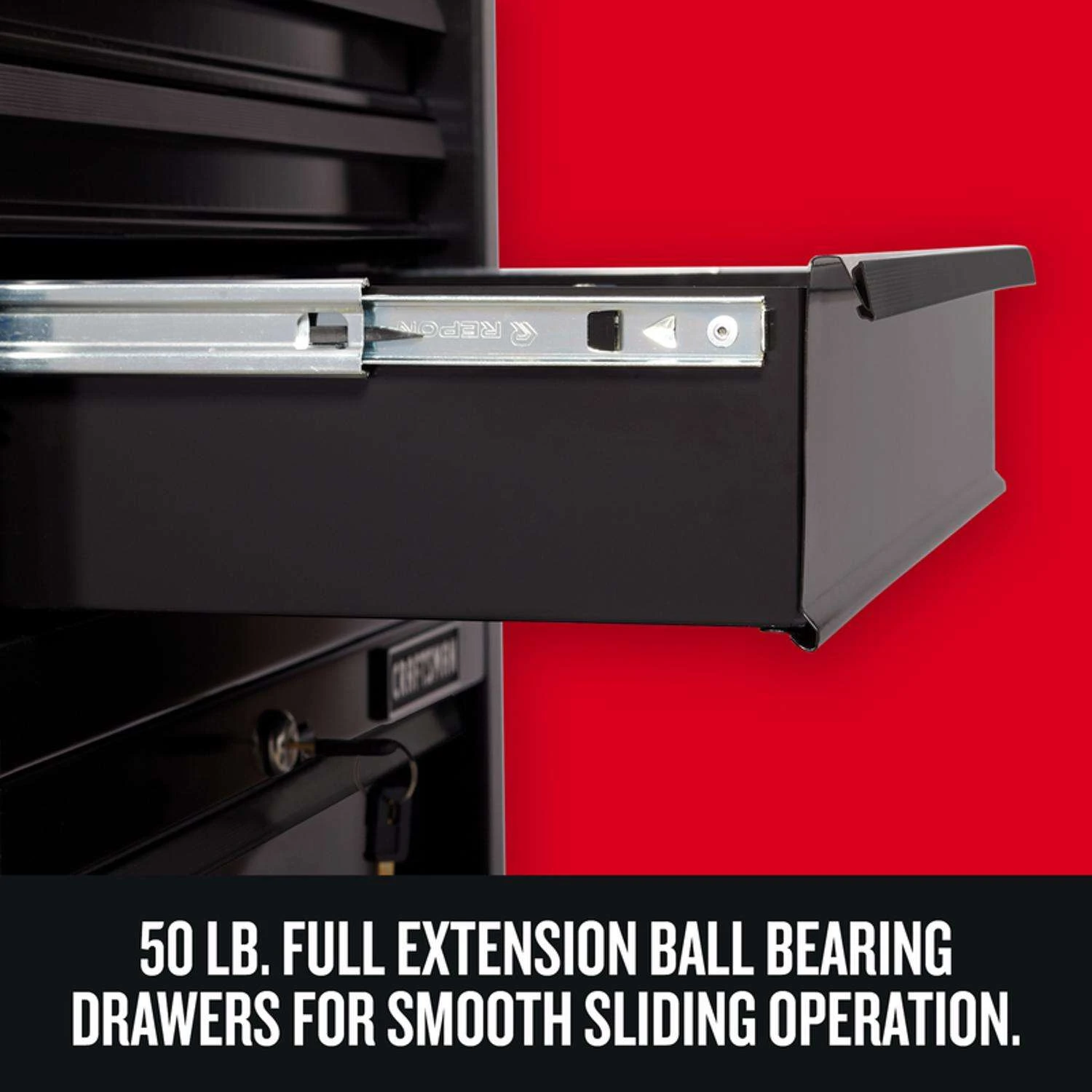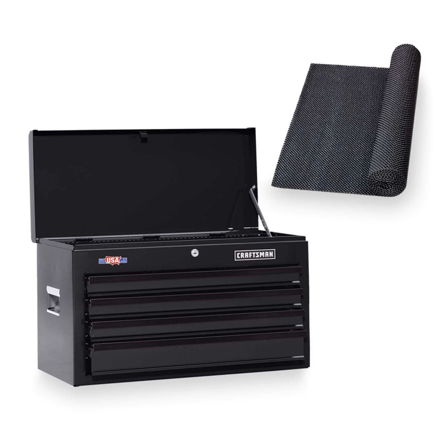 The Craftsman 26-in. wide 4-drawer tool chest is a great helper for any handyman. This metal tool chest features all steel construction, recessed side handles and a secure locking system. Arrange all your tools in the five shallow drawers in a single layer making them easy to locate in an instant. Ball-bearing drawer slides open and close smoothly and can each hold up to 50 lbs. of tools.20 – 24 gauge steel construction is built to lastFull-extension ball-bearing drawer slides operate smoothlyKeyed internal locking system safeguards your toolsHinged cover support holds the chest lid open when in use