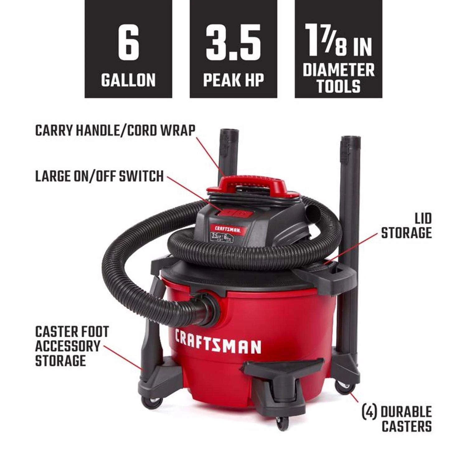 | What's Included | (1) Wet/Dry Vac, (1) 1-7/8 in. x 7 ft. Locking Hose, (2) Locking Extension Wands, (1) Utility Nozzle, (1) Car Nozzle, (1) General Purpose Filter and (1) Dust Collection Bag |