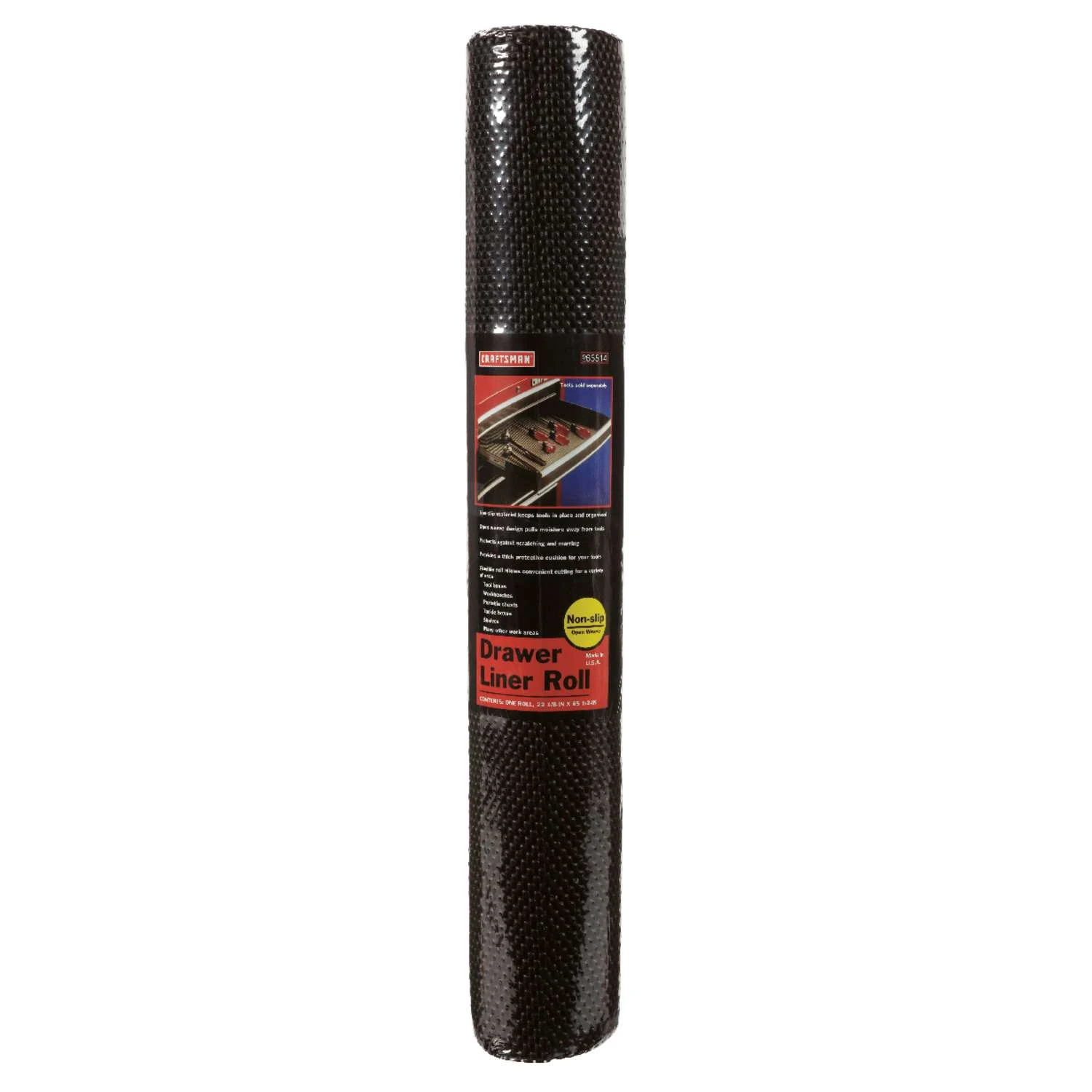 Line your trays and drawers with the Craftsman Drawer Liner Roll to keep your tools from sliding around while in storage. This liner can be cut to fit the drawers in your toolbox, providing a non-slip surface that will prevent your tools from coming unorganized. Tools rest softly on the black cushioned surface, so they’re less likely to get dinged up and scratched. Your tools will last longer as a result and will look better too. This Non-slip Drawer Liner Roll measures 22-1/8 inch wide and has a total length of 85-1/2 inch. Depending on the size of your tool chest, that’s enough material to line up to 8 drawers. The material has an open-weave design helps prevent rust by pulling moisture away from your tools. Your tools are a big investment and this liner better protects them while in storage or during transport.Craftsman Drawer Liner Roll is a non-slip material that keeps tools in place and organizedOpen weave design pulls moisture away from toolsProtects tools and storage against scratching and marringProvides a think protective cushion for toolsCut to fit tool chests, garage organization and other storage1.3 lbs. weight