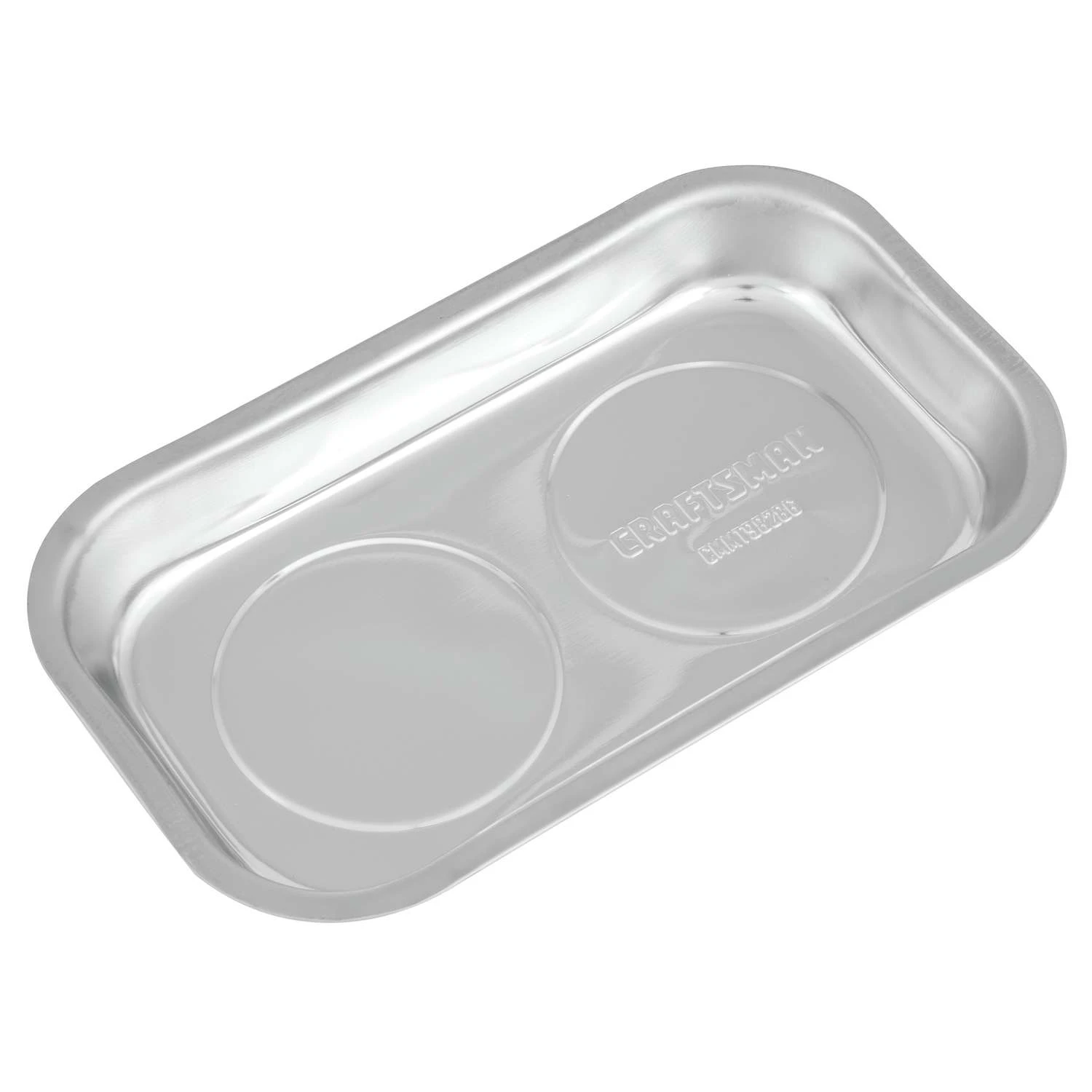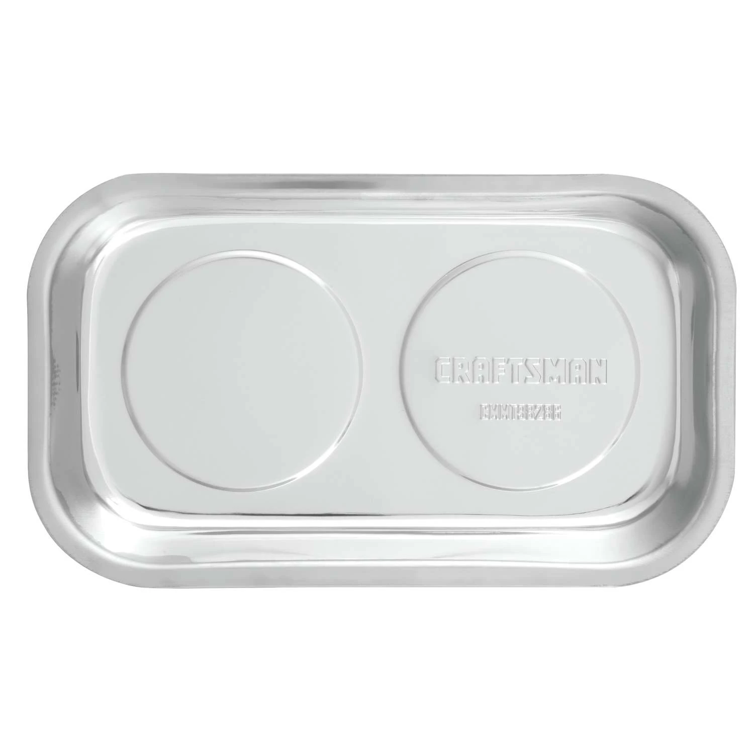 Keep all your small parts handy with the Craftsman Magnetic Tray. The 5-1/2″ x 9-1/2″ rectangular stainless magnetic tray combines organization and convenience with the simple power of magnets. Never worry about scattering all of your fasteners or small parts on accident again.Magnetic base keeps small metal parts and pieces containedRubber base prevents surface scratchingFlat bottom eliminates risk of tipping