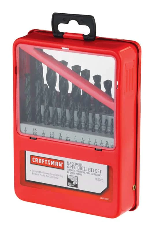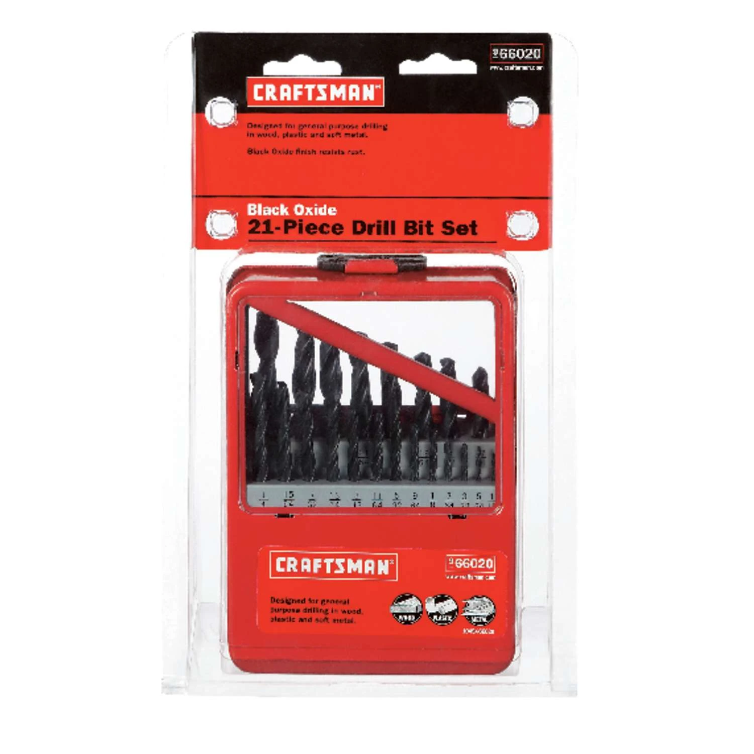 Always have the tool you need on hand with the help of this Craftsman Black Oxide Drill Bit Set. This ultra-versatile set includes 21 different bits that range in size from an itty-bitty 1/16 inch to a more substantial 3/8 inch, so you can drill with finite precision through wood, plastic and soft metals. These 21 options translate to hundreds of completed projects, whether you count on drilling to make a living or you just want to really power through that honey-do list. A must have for any handyman or DIY lady, this 21 piece Drill Bit Set features a black oxide coating that both extends bit life and makes for better general-purpose drilling. Just be sure you always put your bits back in the convenient metal case (included), because perhaps the only thing worse that not having the right tool for the job is not being able to find it among all the clutter.This Craftsman black oxide drill bit set is designed for general purpose drilling of wood, plastic and soft metalMade from sturdy high speed steel (HSS), with black oxide coating for extended bit life and better performanceAlso includes convenient metal case for keeping all your bits organized