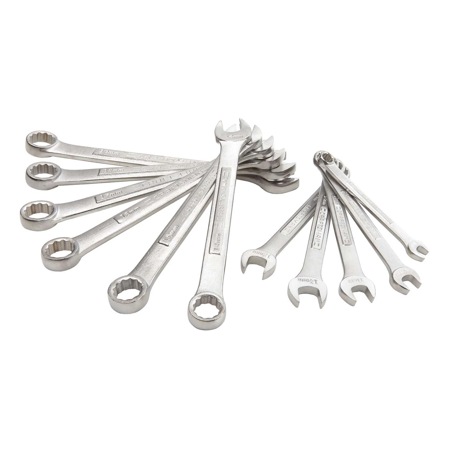 The Craftsman 11 pc. Large Metric Combination Wrench Set offers a number of applications from standard bolt turning to specific automotive repairs.Full polish chrome finish for corrosion resistance12 point box end with fastener for quick engagement15 deg. box end offset for additional knuckle clearanceLarge markings for quick size identificationMeets or exceeds ASME specificationsCommon applications include automotive, mechanical and home repair