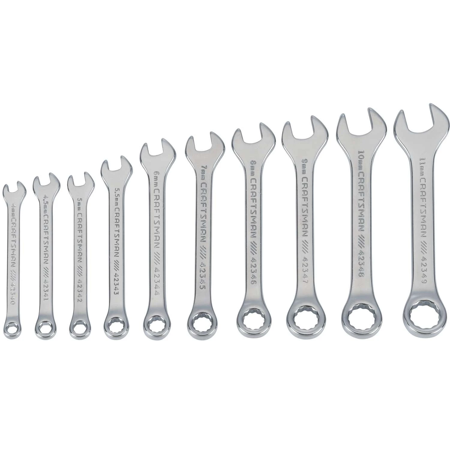 The CRAFTSMAN® 10-piece Metric Miniature Combination Wrench Set includes 10 wrenches, each crafted to feature a miniature combination wrench design. These wrenches are the perfect solution for extremely difficult-to-reach areas. Backed by our CRAFTSMAN Full Lifetime Warranty, this set prioritizes quality and durability over everything else.CORROSION RESISTANCE: Full Polish Chrome FinishQUICK ENGAGEMENT: 12 Point Box End with fastenerQUICK SIZE IDENTIFICATION: Large MarkingsMeets or Exceeds ASME Specifications