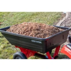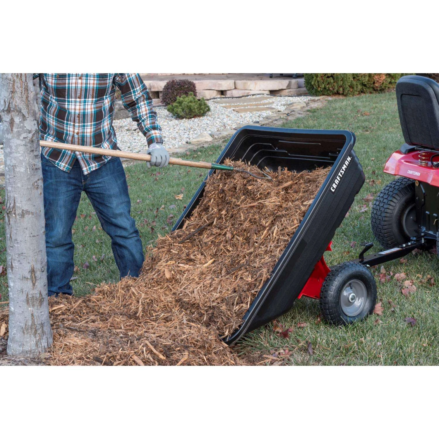 The CMXGZBF7124489 10-cu ft poly cart allows you to use your lawn tractor or ATV to easily transport rock, dirt, mulch and other landscaping materials. Emptying your cart is effortless with the foot pedal dump release and 40 degree dump angle.500 pound load capacity allows you to haul large quantities of firewood, soil, rocks and more14 inch pneumatic ribbed style tires roll gently across your lawnOne piece rust resistant poly bed