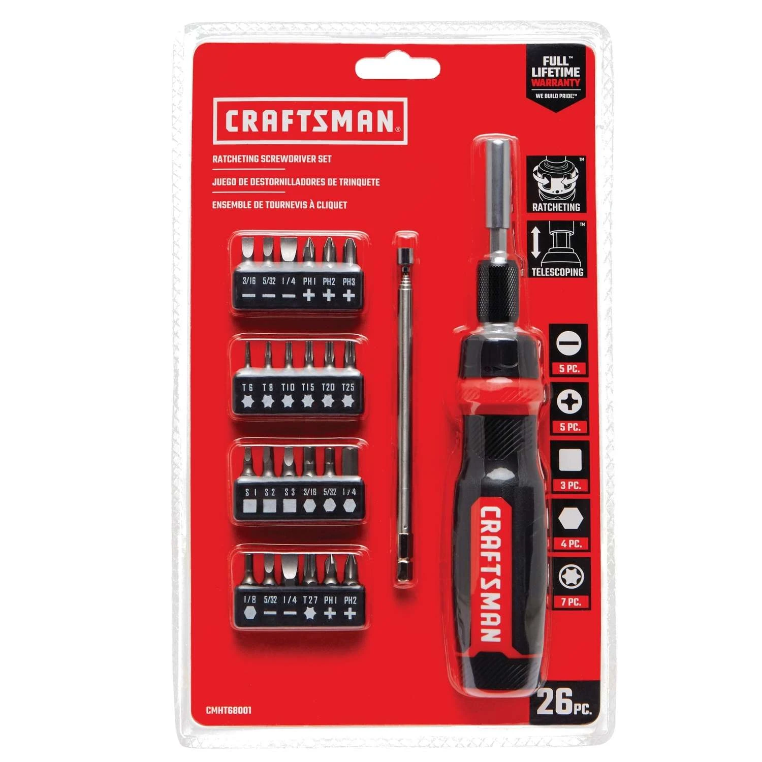 | What's Included | Ratcheting screwdriver, Telescoping pick up tool, SQ #1, SQ #2, SQ #3, H 3/16-in., H 5/16-in., H 1/4-in., T6, T8, T10, T15, T20, T25, SL 3/16-in., SL 5/32-in., SL 1/4-in., PH1, PH2, PH3, 1/4DR Nutdriver 3/16-in., 1/4DR Nutdrivers 1/4-in., 1/4DR Nutdrivers |