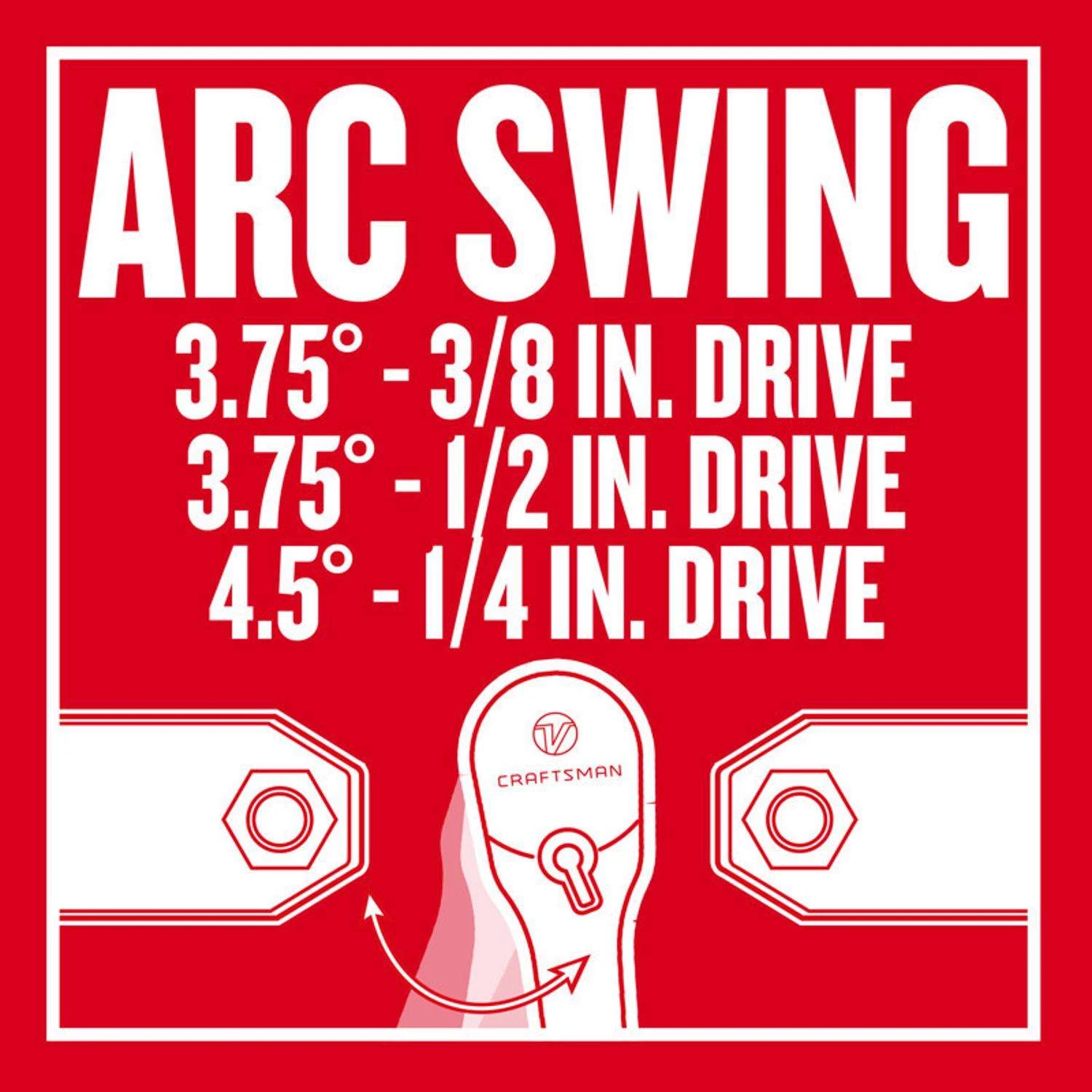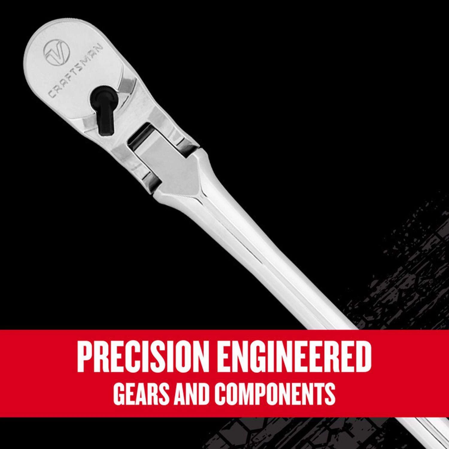 Be ready to take on any project with these V-Series™ 1/4 in., 3/8 in., and 1/2 in. Drive Long Flex Head Ratchets. These ratchets were built for professional-grade performance with a 180° articulating head for greater access to hard-to-reach fasteners compared to standard ratchets. Long life, strength, and durability are delivered by precision-engineered gears and working in confined spaces is made easy with compressed arc swings and optimized grips for strength at any angle.ACCESS CONFINED SPACES: 4-1/2° on 1/4 in. Drive and 3/8 in. Drive, 3-3/4° arc swing on 1/2 in. DriveMAINTAIN PRODUCTIVITY with a 180° Articulating Head that helps you grip hard-to-reach fastenersBUILT FOR STRENGTH AND DURABILITY with precision-engineered gearsBACKED BY A LIFETIME WARRANTY: Designed to deliver the quality and durability expected from the CRAFTSMAN brand – if the product fails to perform, we’ll replace it