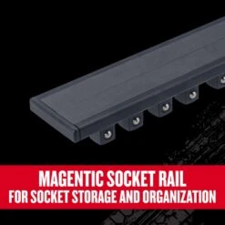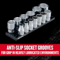 | What's Included | (13) 1/2 in. Drive 6 Point Shallow Sockets – 3/8 in., 7/16 in., 1/2 in., 9/16 in., 5/8 in., 11/16 in., 3/4 in., 13/16 in., 7/8 in., 15/16 in., 1 in., 1-1/16 in. and 1-1/8 in., and an 8 in. Double Black Rail With 13 Nubs |