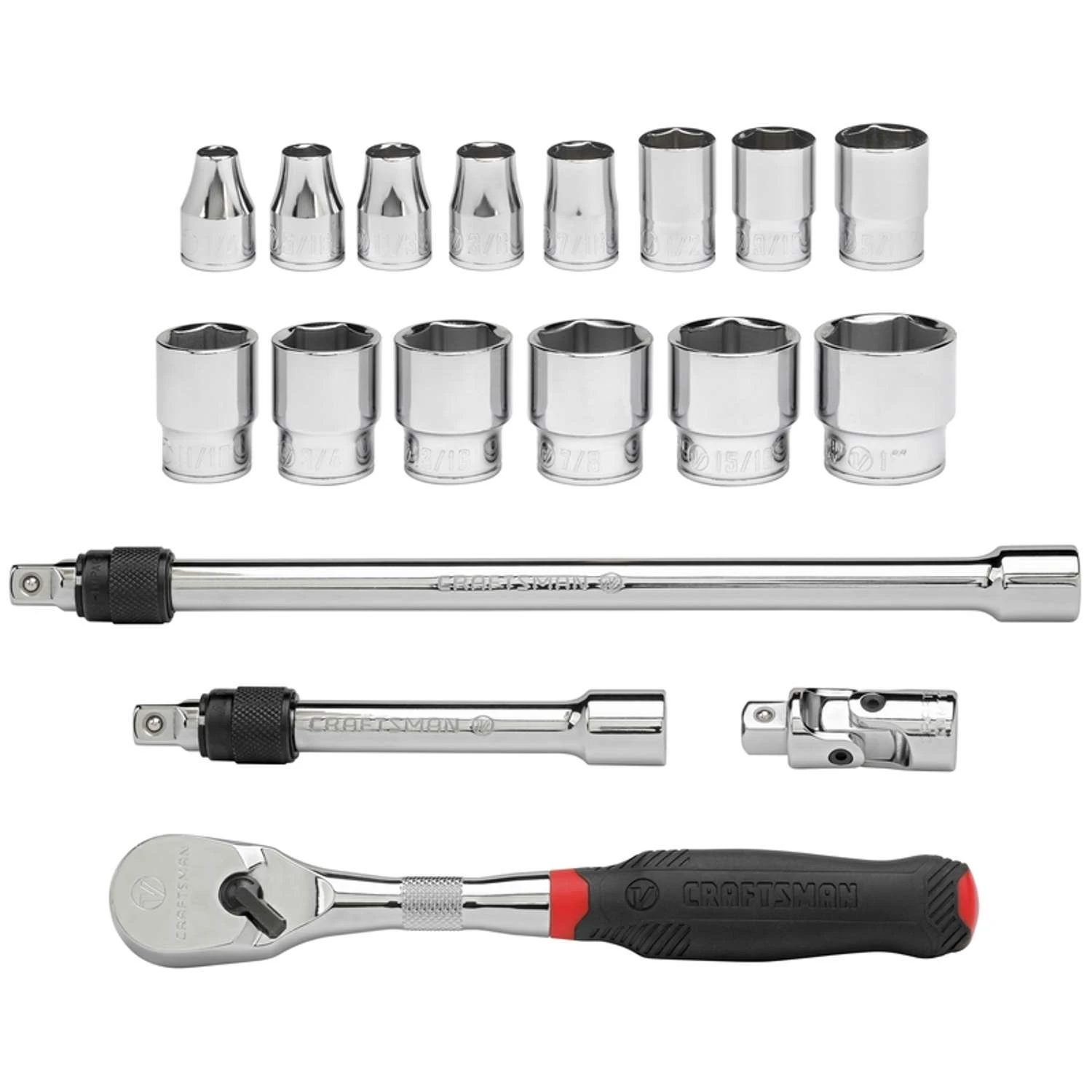 | What's Included | (1) 3/8 in. Drive Bi-Material Ratchet, (14) 3/8 in. Drive 6 Point Shallow Sockets – 1/4 in., 5/16 in., 11/32 in., 3/8 in., 7/16 in., 1/2 in., 9/16 in., 5/8 in., 11/16 in., 3/4 in., 13/16 in., 7/8 in., 15/16 in., 1 in., (1) 3/8 in. Drive Universal Joint, ( |