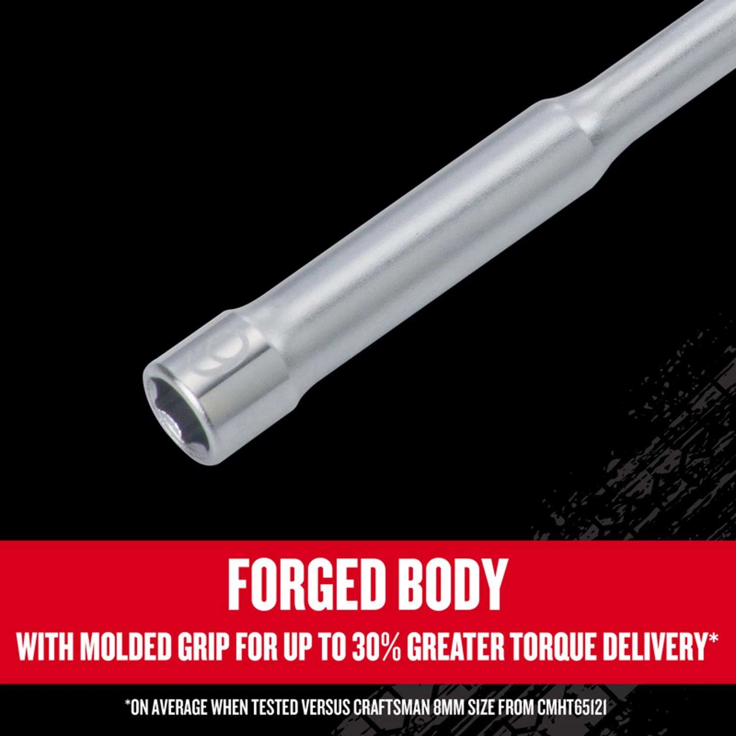 The Craftsman® V-Series 6pc Metric Nut Driver Set leverages a forged steel body and sturdy over-molded grip to deliver up to 30% greater torque. The handles are designed with the mechanic in mind blending precision, torque and control, with a soft touch material that offers comfort and verified 2x protection against the most common garage solvents. The 6-point design helps maximize fastener contact with a deep opening for clearing longer threads.UP TO 30% MORE TORQUE – Forged body with molded grip for up to 30% greater torque deliveryVERIFIED 2X SOLVENT PROTECTION – Soft touch grip wit 2x solvent protectionPRO-HANDLE DESIGN – Blends precision, torque and control6 POINT SOCKET – With deep opening for long threads