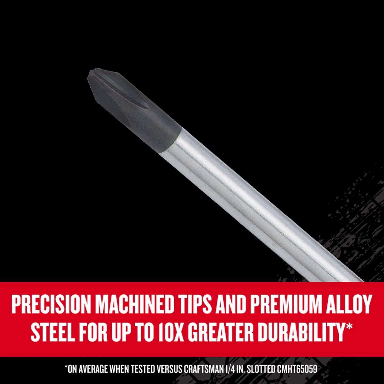 The Craftsman® V-Series 8pc Combo Screwdriver Set leverages premium alloy steel and precision machined tips to deliver up to 10x greater durability. The handles are designed with the mechanic in mind blending precision, torque and control, with a soft touch material that offers comfort and verified 2x protection against the most common garage solvents. Larger sizes also include a wide bolster with ample space to grip and wrench when additional torque is requiredUP TO 10X MORE DURABLE – Precision machined tips and premium alloy steel for up to 10x greater durabilityVERIFIED 2X SOLVENT PROTECTION – Soft touch grip wit 2x solvent protectionPRO-HANDLE DESIGN – Blends precision, torque and controlTORQUE DELIVERY- Wide bolster for high torque wrenching (select sizes)