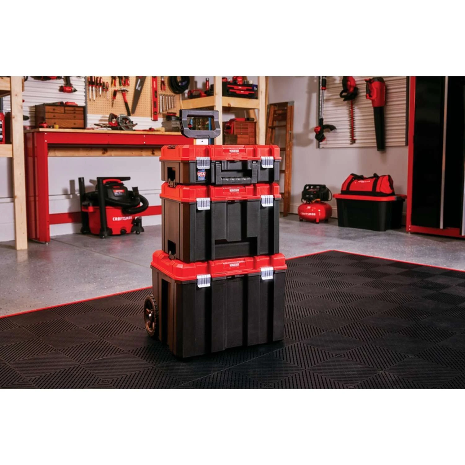 This water sealed Craftsman VERSASTACK system tower offers 3 essential products bottom rolling unit for large tools and items, middle tool box for large tools and suitcase for power tools and hand tools. The 3 units connect to each other through side latches for secure maneuverability.Water and dust resistant IP54 ratedTelescopic handle on mobile unit leans backwards to allow for maximum volume storageAdded security heavy-duty rust resistant metal latchesCompatible part of the VERSASTACK system stackable, portable, customizablePush button available for easy handle opening and closing